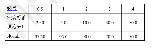 濁度標準液的制備 取濁度標準原液與水,按下表配制,即得。本液應臨用時制備,使用前充分搖勻。