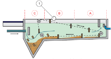 如下圖2所示,同樣B區(qū)也是較為理想的安裝區(qū)域。目前在平流式的沉淀池中,安裝在C區(qū)的情況較為普遍,產(chǎn)生的問題有:1、探頭安裝位置與池壁過近,回波中的干擾信號(hào)會(huì)影響測(cè)量值的準(zhǔn)確性;2、底部污泥斗過于陡峭,SONATAX sc探頭無(wú)法準(zhǔn)確測(cè)量出池底深度(注意:在某些平流式沉淀池的設(shè)計(jì)中,污泥斗底部為水平結(jié)構(gòu),SONATAX sc可以準(zhǔn)確測(cè)量出池底深度。此時(shí),污泥斗的正上方可以作為理想的安裝位置)