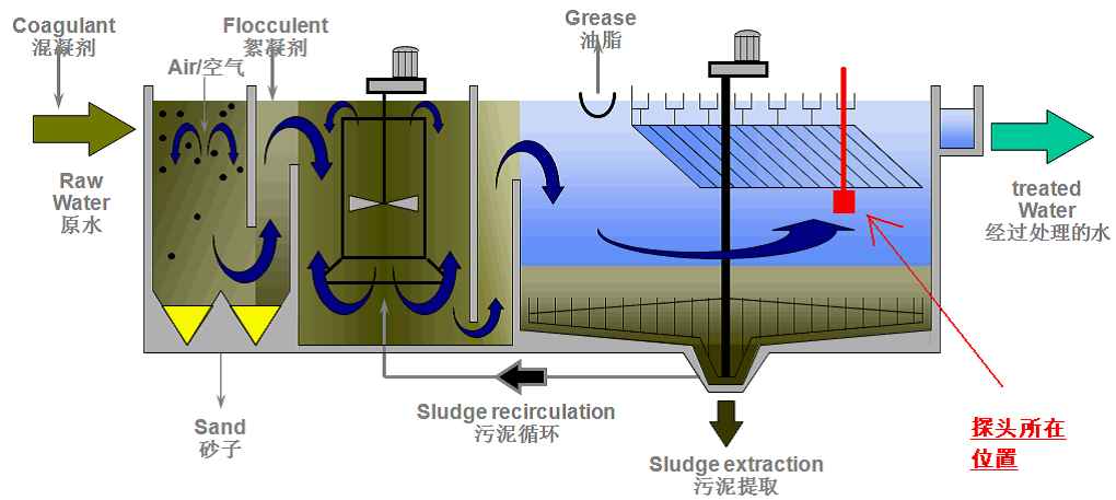 對(duì)于幅流式沉淀池,傳感器可安裝在刮泥機(jī)橋架上;